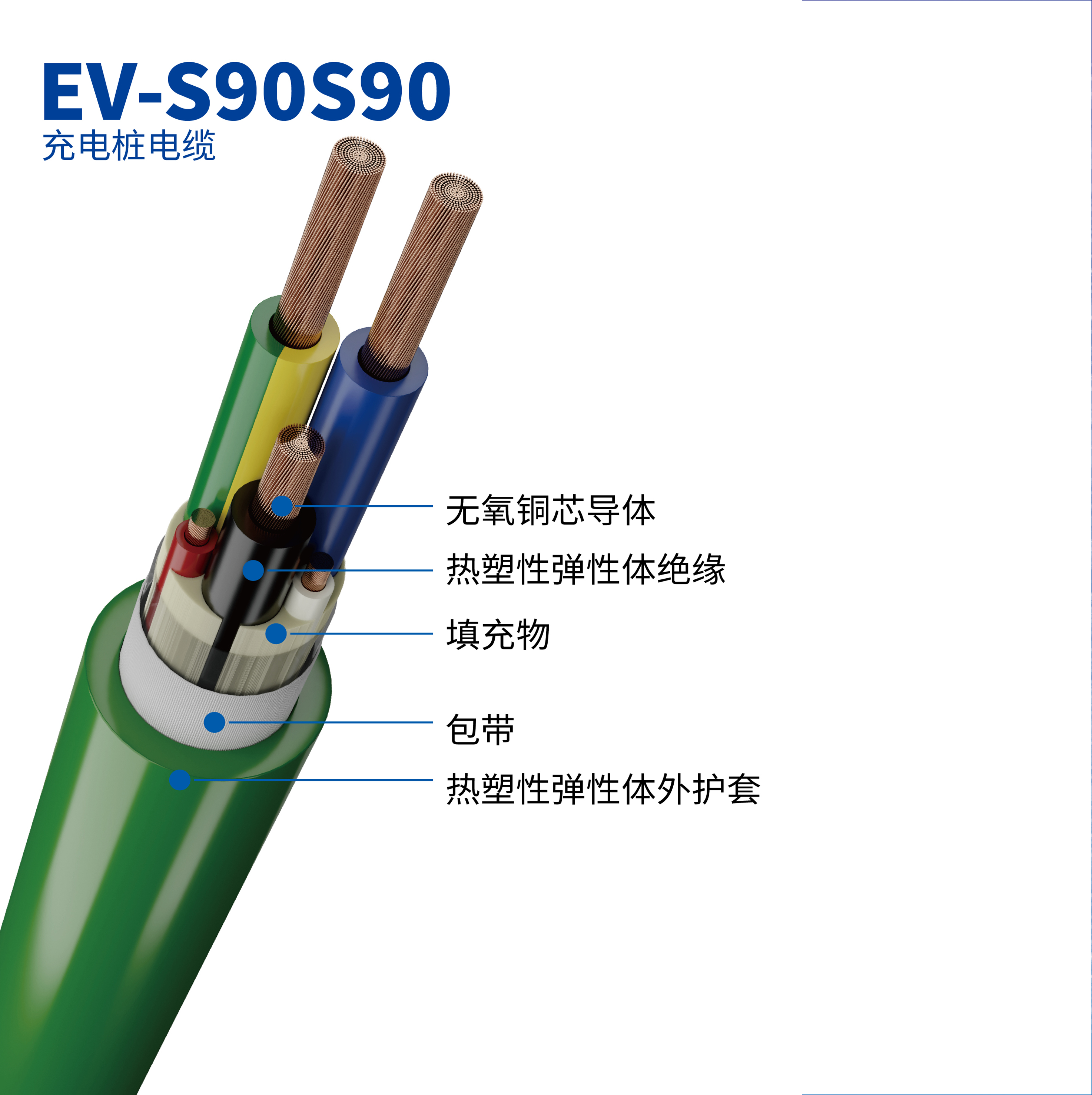 字母含義:EV:電動(dòng)汽車電纜;DC:直流;R:第6類導(dǎo)體;第1個(gè)S90:TPE絕緣;第2個(gè)S90:TPE護(hù)套