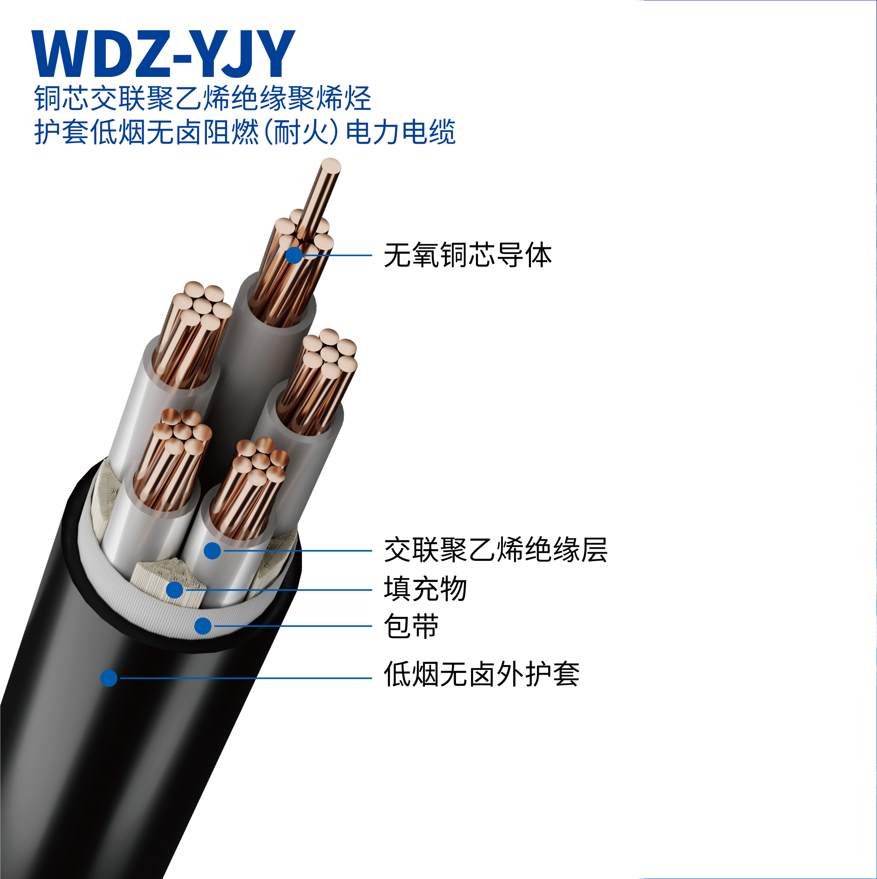 字母含義:W:無(wú)鹵;D:低煙;Z:阻燃;YJ:交聯(lián)聚乙烯絕緣;Y:聚烯烴護(hù)套