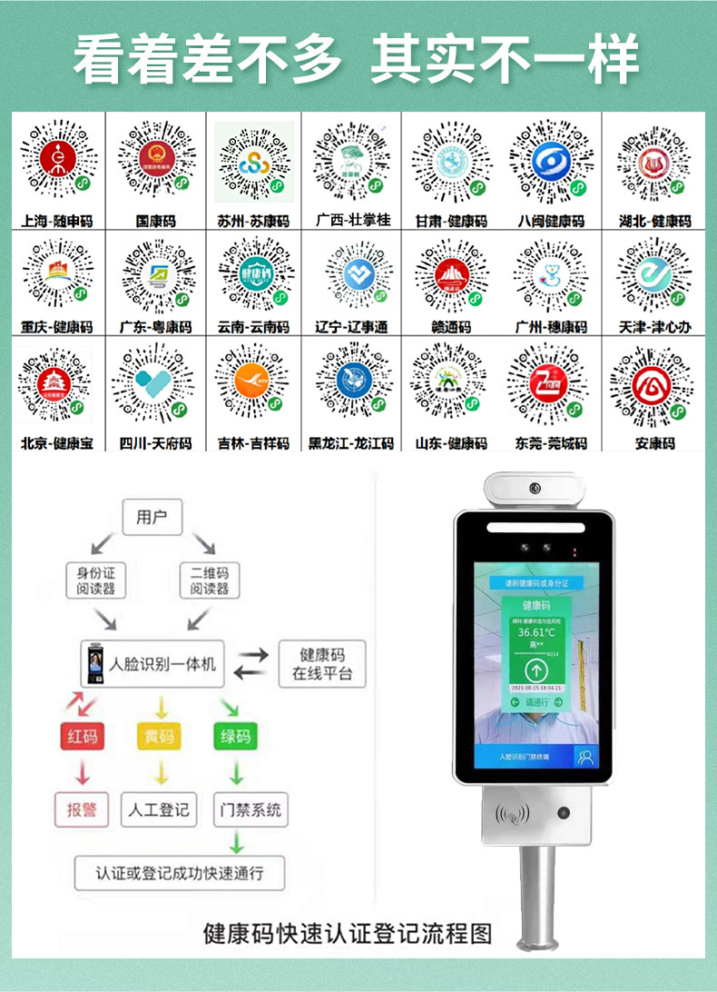 國家通用碼-國康碼、廣東-粵康碼、四川-天府通、江蘇-蘇康碼、內蒙-內蒙碼、上海-隨申碼、湖北-湖北碼、安徽-安徽碼、福建-八閩碼、河北健康碼、云南-云南碼、湖南-湖南碼,更多省市可對接。