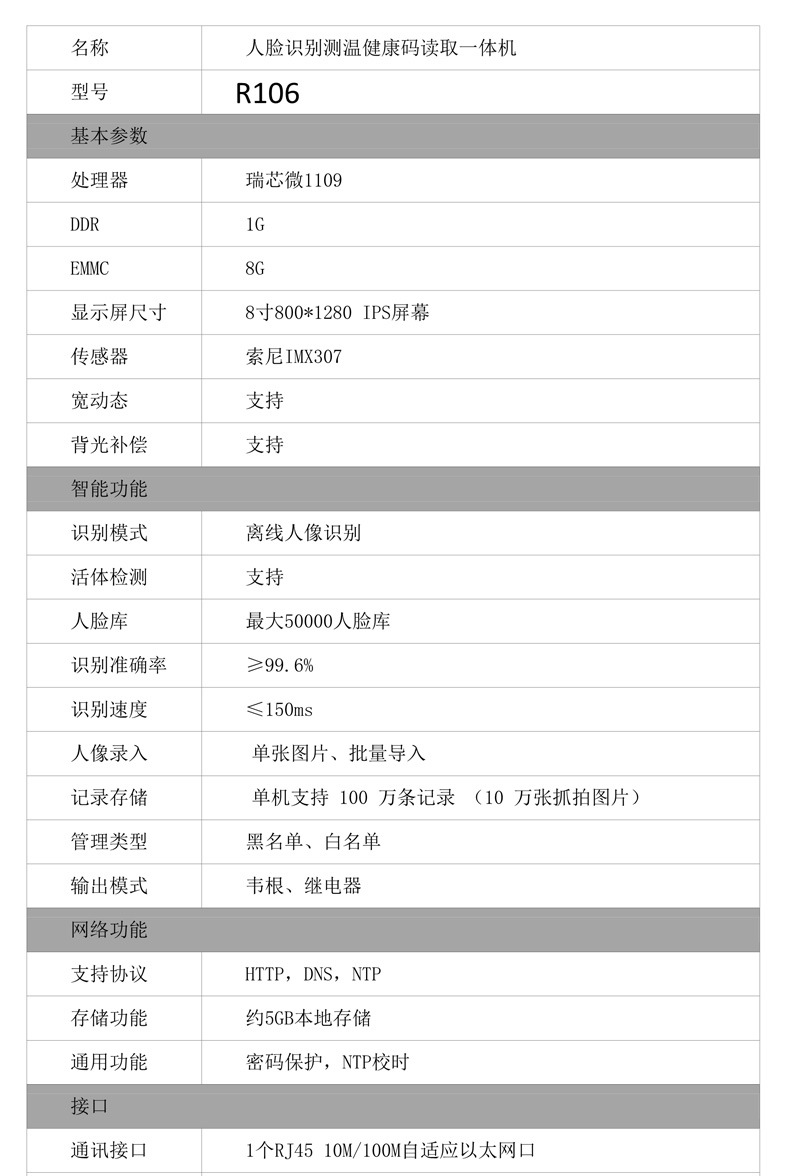 (*由于產品升級或其他原因,明創(chuàng)IDR-R106健康碼識別機產品實際參數(shù)有可能變更,以實際產品為準。本文中的所有陳述、信息和建議也不構成任何明示或暗示的擔保)