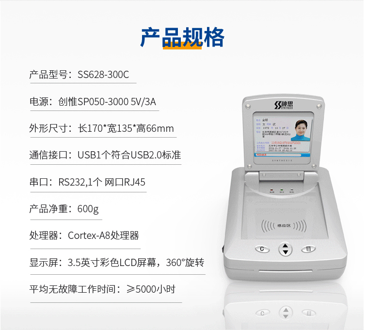 (*由于產(chǎn)品升級或其他原因,神思SS628-300c臺式居民身份證閱讀機具產(chǎn)品實際參數(shù)有可能變更,以實際產(chǎn)品為準。本文中的所有陳述、信息和建議也不構(gòu)成任何明示或暗示的擔保)