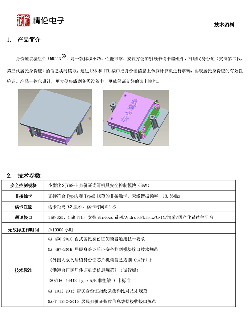 (*由于產(chǎn)品升級(jí)或其他原因,精倫IDR223身份證組件產(chǎn)品實(shí)際參數(shù)有可能變更,以實(shí)際產(chǎn)品為準(zhǔn)。本文中的所有陳述、信息和建議也不構(gòu)成任何明示或暗示的擔(dān)保)