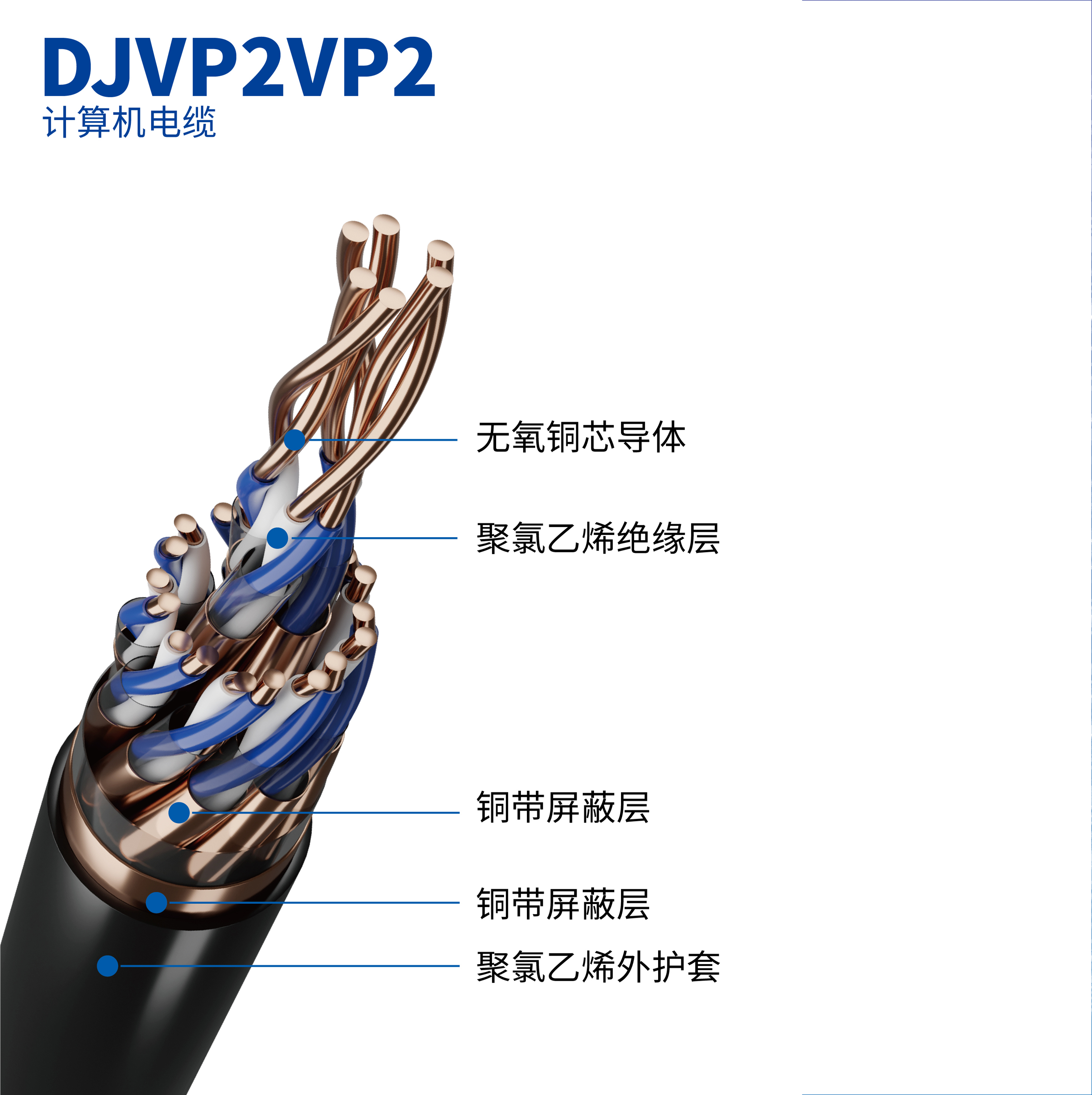 字母含義:DJ:計(jì)算機(jī)與儀表屏蔽電纜;V:聚氯乙烯絕緣護(hù)套;Y:聚氯乙烯絕緣護(hù)套;YJ:交聯(lián)聚烯烴絕緣;P:銅絲編織屏蔽;P2:銅帶鎧裝;P3:鋁塑復(fù)合帶屏蔽