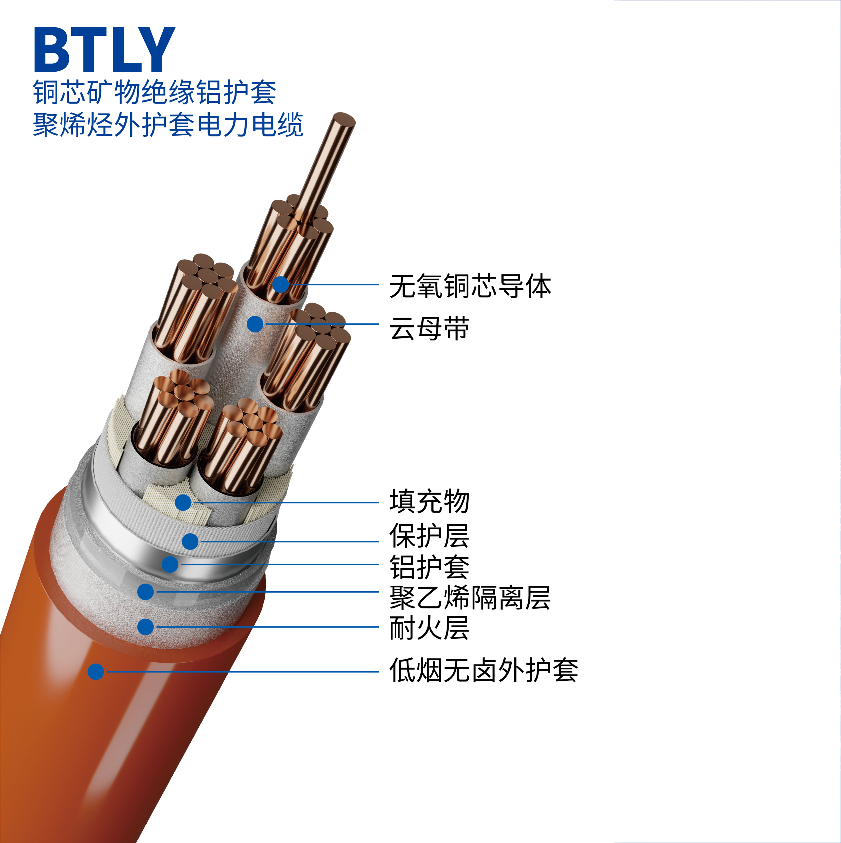 字母含義:B:礦物絕緣電纜系列代號;T:銅導(dǎo)體;L:鋁護(hù)套;Y:聚烯烴外護(hù)套