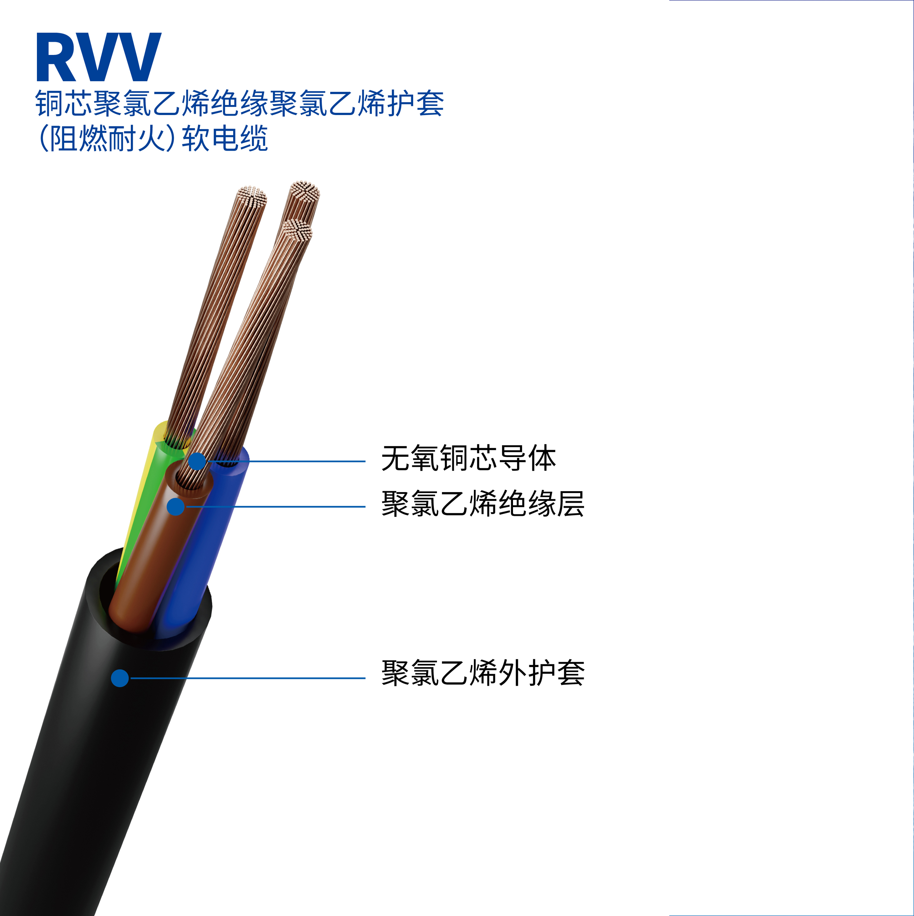 字母含義:R:連接用軟線;第1個(gè)V:聚氯乙烯絕緣;第2個(gè)V:聚氯乙烯護(hù)套;
