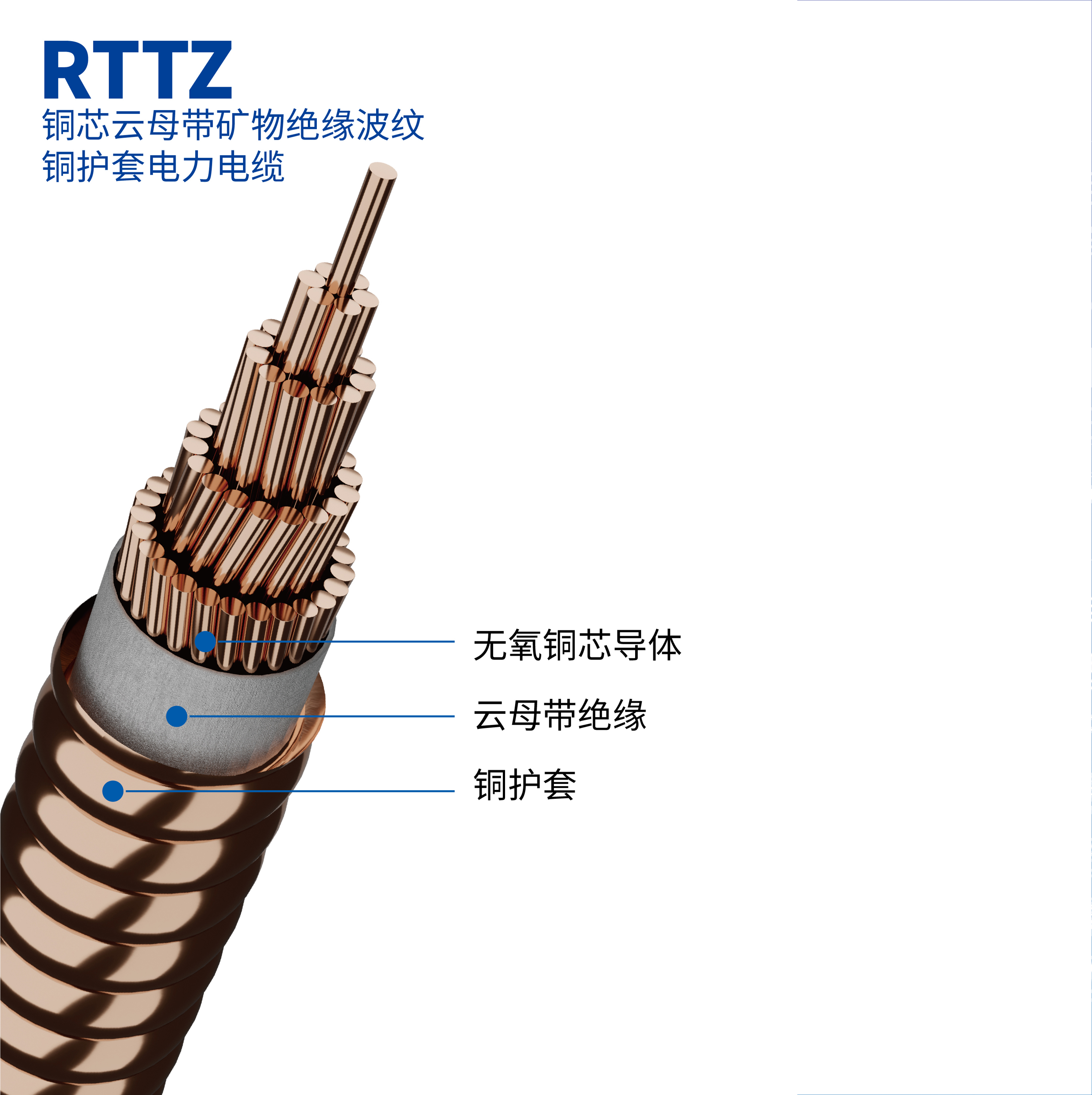 字母含義:R:云母帶礦物絕緣波紋銅護套電纜系列代號;第1個T:銅導體;第2個T:銅護套;Z:云母帶;Y:聚烯烴外護套(V:聚氯乙烯外護套)