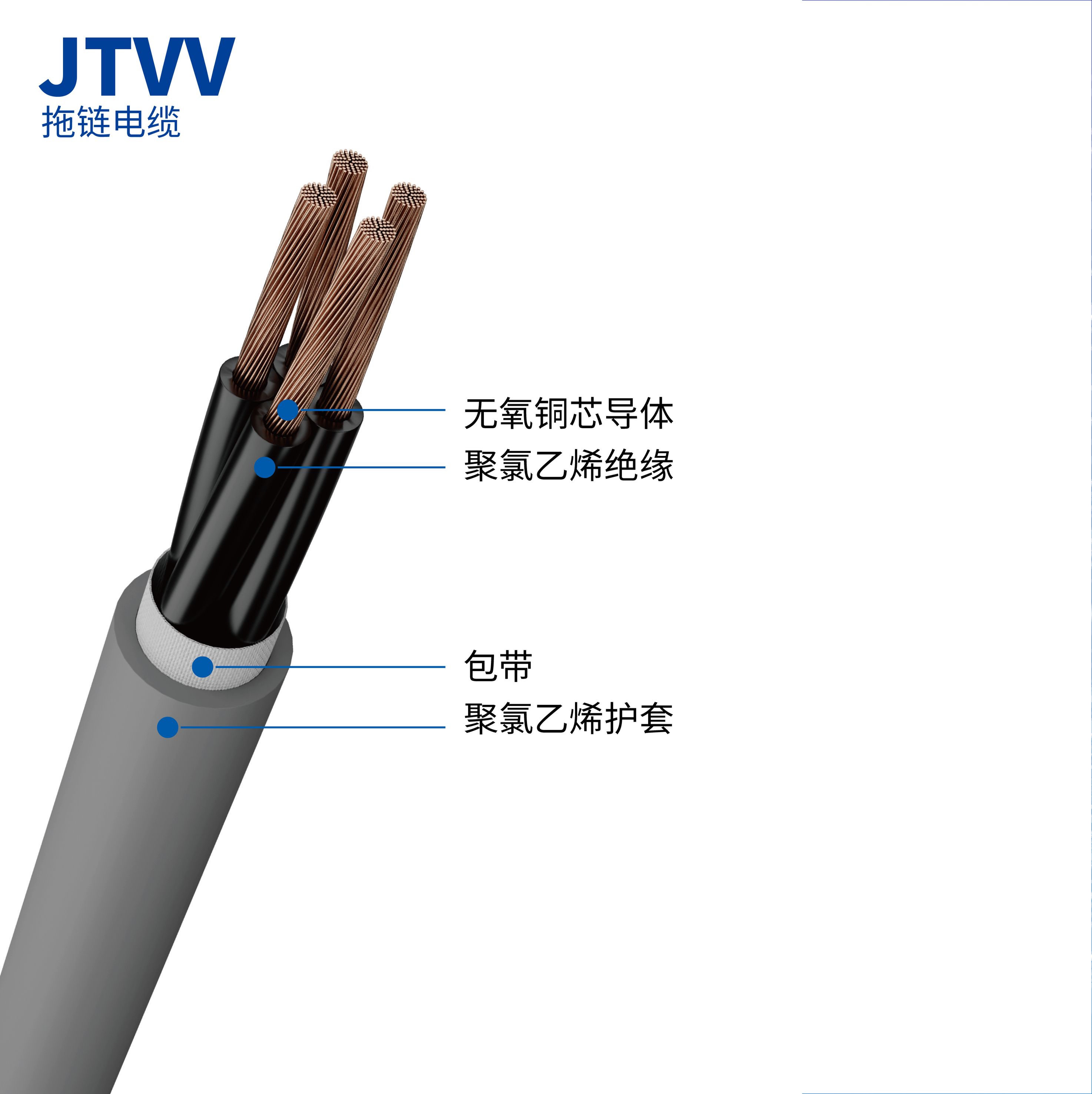 字母含義:JT:機(jī)器人拖鏈電纜;第1個(gè)V:聚氯乙烯絕緣,第2個(gè)V:聚氯乙烯護(hù)套